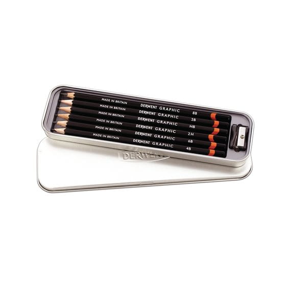 Zestaw Derwent Graphic zawiera ołówki o twardości: 2H, HB, 2B, 4B, 5B, 6B, 8B oraz temperówkę. Solidne, metalowe opakowanie ułatwiające przechowywanie zestawu.