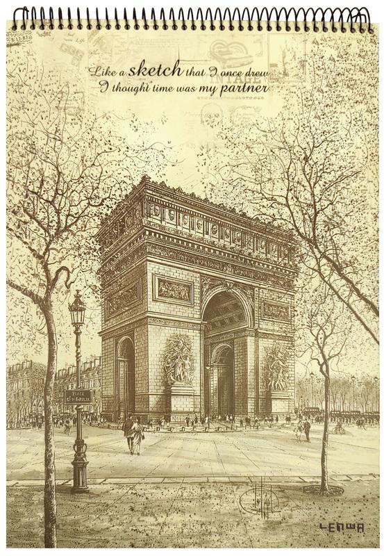 Gruby, lekko fakturowany papier o naturalnym kremowym odcieniu. Praktyczna plastikowa rączka ułatwia przenoszenie. Twarda okładka przedstawia szkic Łuku Triumfalnego.