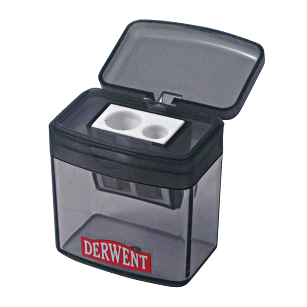 Podwójna temperówka firmy DERWENT do temperowania kredek i ołówków o grubości 6-8 mm i 9-12 mm, z pojemnikiem na strużyny.