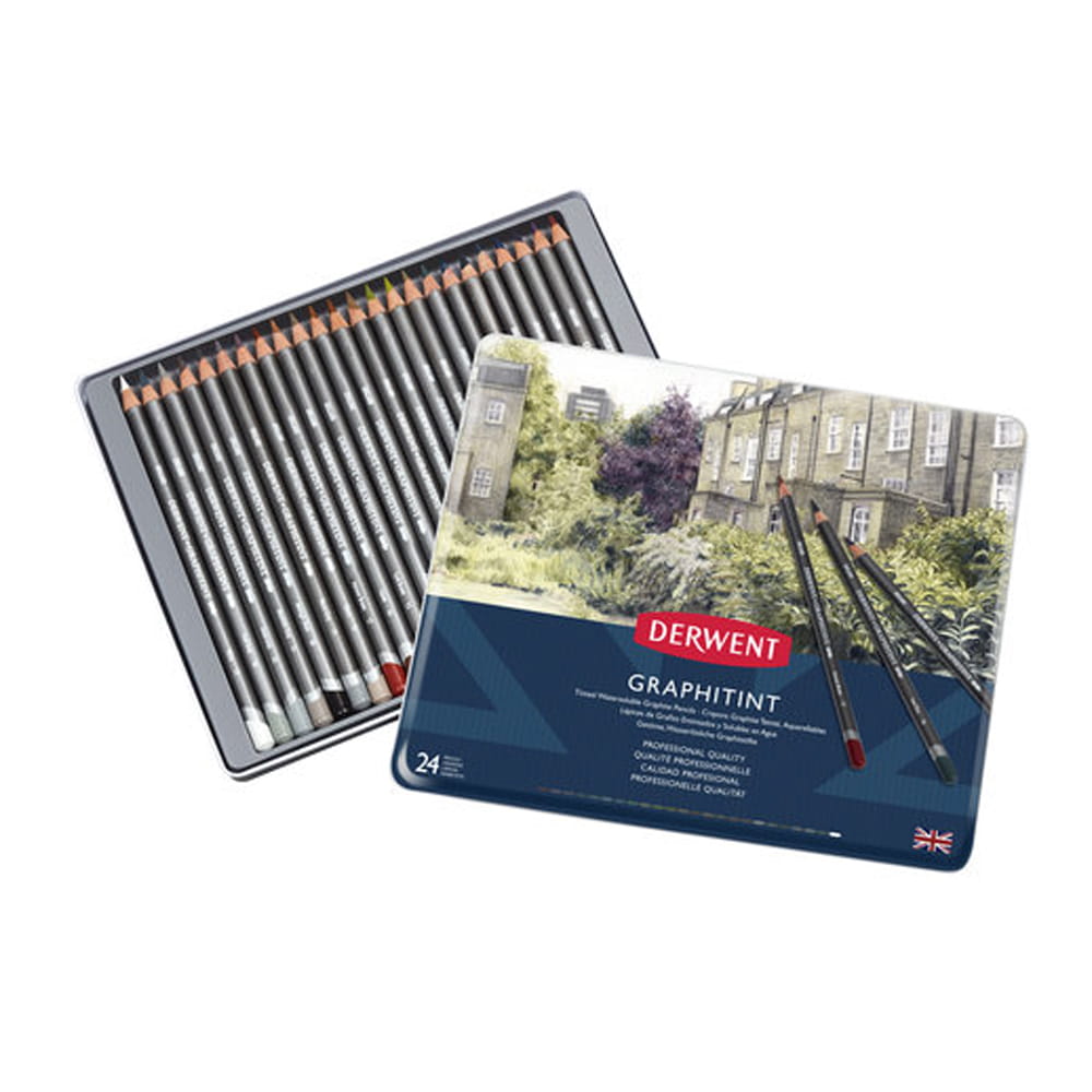 Zestaw 24 kolorowych, wodorozpuszczalnych ołówków Derwent Graphitint w metalowym pudełku.