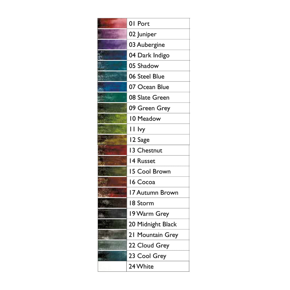 Zestaw zapakowany w metalowe pudełko to 24 kolory "naturalne": odcienie brązu, szarości, zielenie.